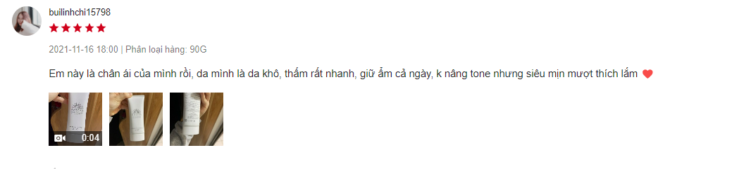 Người dùng nhận xét sản phẩm thấm rất nhanh, giữ ẩm cả ngày, không nâng tone nhưng khiến da mướt mịn, phù hợp với bạn là da khô.