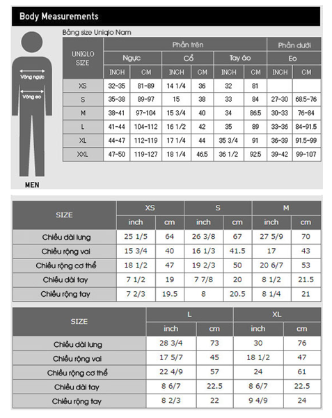 Các size quần áo Uniqlo của Nhật Bản Size quần áo của Nhật Bản được tính theo chuẩn quốc tế gồm: