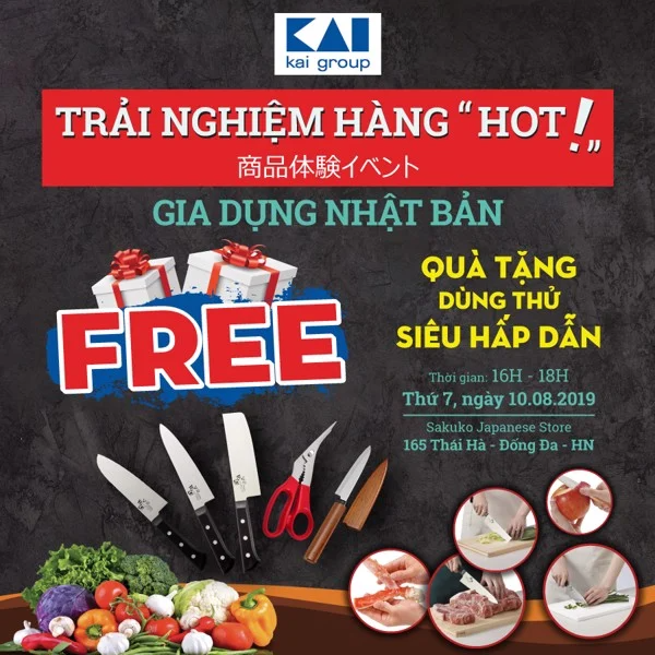 Ngày 10/8, với mong muốn đem lại cho người tiêu dùng Việt những sản phẩm tốt nhất đến từ Nhật Bản. Tại siêu thị Sakuko 165 Thái Hà, Đống Đa, Hà Nội, quý khách hàng sẽ có cơ hội TRẢI NGHIỆM MIỄN PHÍ VÀ NHẬN QUÀ TẶNG DÙNG THỬ SIÊU HẤP DẪN các dòng sản phẩm đến từ thương hiệu Kai. Ngoài ra trong 2 ngày: 10/8 và 11/8, quý hàng sẽ nhận được ưu đãi 15% khi mua các dòng sản phẩm đến từ thương hiệu này. Hãy đến Sakuko 165 Thái Hà để trải nghiệm các sản phẩm của chúng tôi!